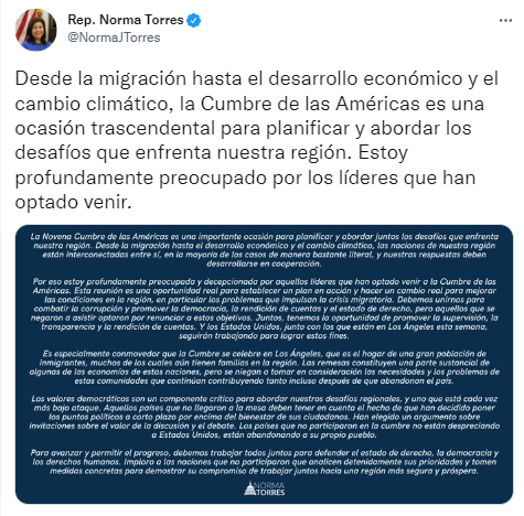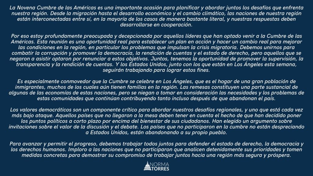 “Es especialmente conmovedor que la Cumbre se celebre en Los Ángeles, que es el hogar de una gran población de inmigrantes, muchos de los cuales aún tienen familias en la región. Las remesas constituyen una parte sustancial de algunas de las economías de estas naciones, pero se niegan a tomar en consideración las necesidades y los problemas de estas comunidades que continúan contribuyendo tanto incluso después de que abandonan el país”, agregó.