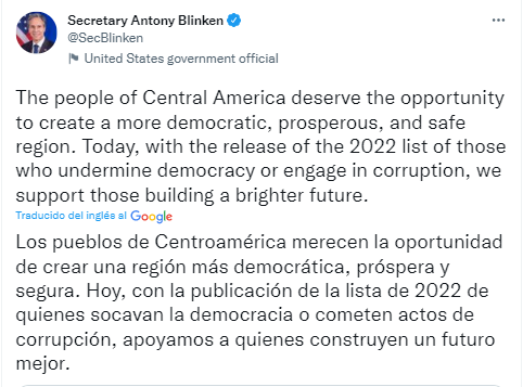 El Secretario de Estado de los Estados Unidos, Antony Blinken publicó este miércoles en su red social Twitter la Lista Engel 2022, en la aparecen los vicepresidentes del Congreso hondureño, Rasel Tomé y Edgardo Casaña así como el asesor presidencial Enrique Flores Lanza y otros exfuncionarios de la pasada administración