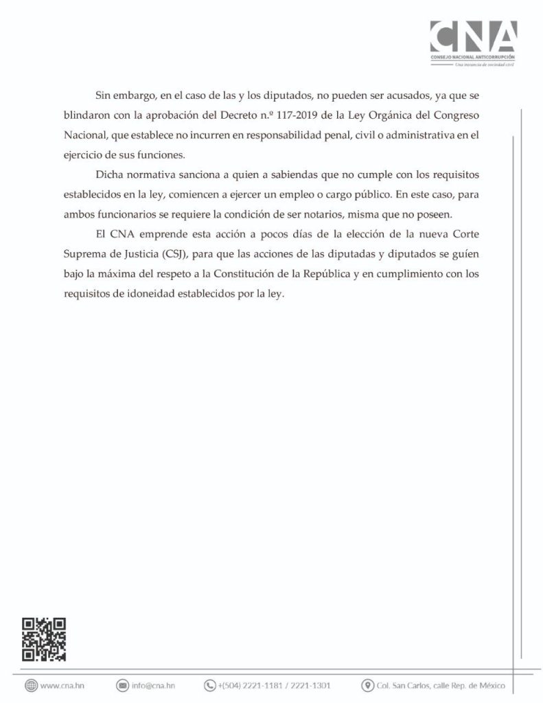 La Directora Ejecutiva del CNA Gabriela Castellanos al mismo tiempo señaló que la Junta Directiva del Congreso Nacional es ilegal y fueron ellos mismos los que nombraron y juramentaron violentando la Constitución al Procurador General y subprocurador como actos preparatorios de la gran corrupción.