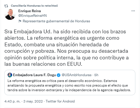 “Sra Embajadora Ud. ha sido recibida con los brazos abiertos. La reforma energética es urgente como Estado, combate una situación heredada de corrupción y pobreza. Nos preocupa su desacertada opinión sobre política interna, la que no contribuye a las buenas relaciones con EEUU”. Respondió Reina en su red social Twitter.
