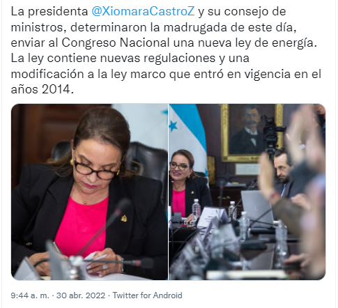 El presidente de la Comisión de Energía Hugo Noe Pino, destacó que el objetivo es brindar un servicio de energía eléctrica con precios justos, además se pretende resolver la deuda acumulada de la Empresa Nacional de Energía Eléctrica (ENEE), la cual es de 75 mil millones de lempiras.
