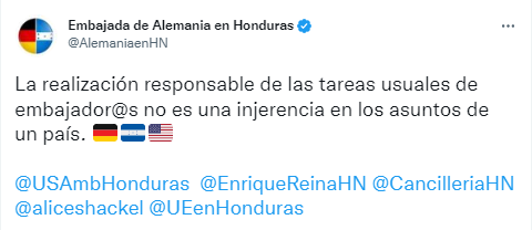 “La realización responsable de las tareas usuales de embajador@s no es una injerencia en los asuntos de un país”, apunta de forma textual el mensaje escrito en la cuenta de Twitter de la embajada alemana en Honduras.