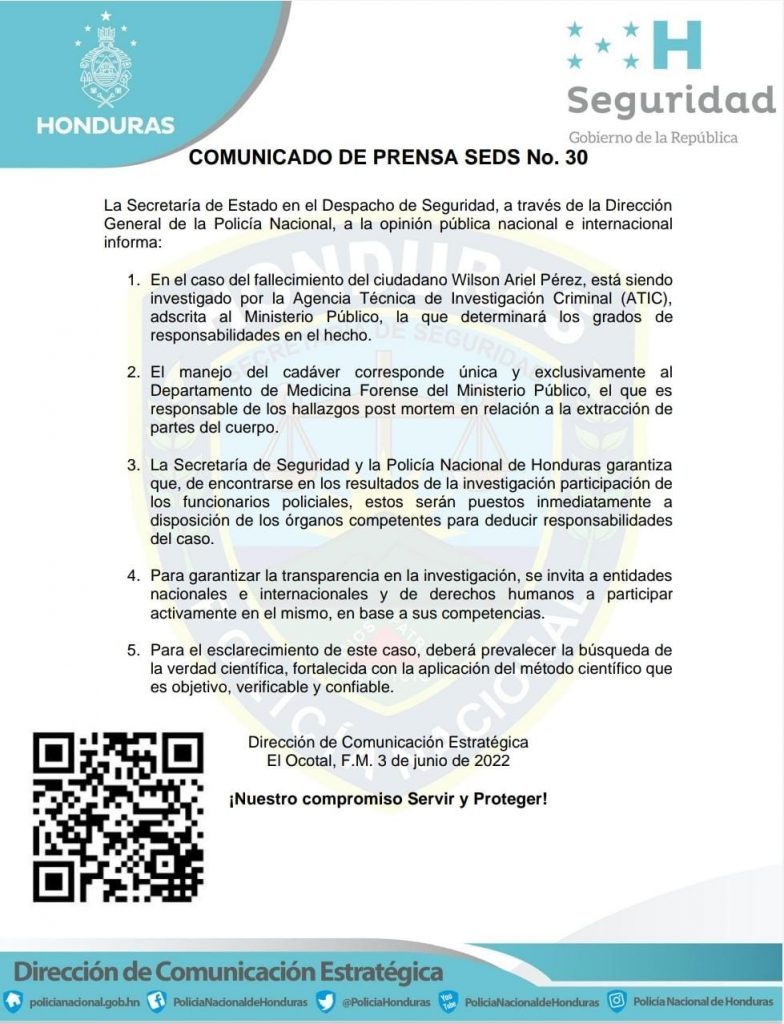 La Policía Nacional con el fin de transparentar el caso, invitó a organizaciones nacionales e internacionales de derechos humanos a participar en el proceso de investigación del crimen contra Wilson Pérez Hernández.