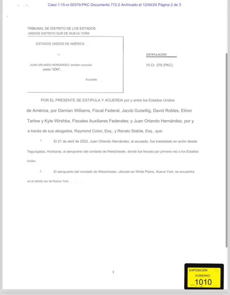 La abogada Ana de Hernández, esposa del expresidente Juan Orlando Hernández presentó el documento de Estipulación que la Fiscalía del SDNY dio al Abogado Stabile conteniendo información falsa sobre el LUGAR donde fue llevado por primera vez el exgobernante hondureño.