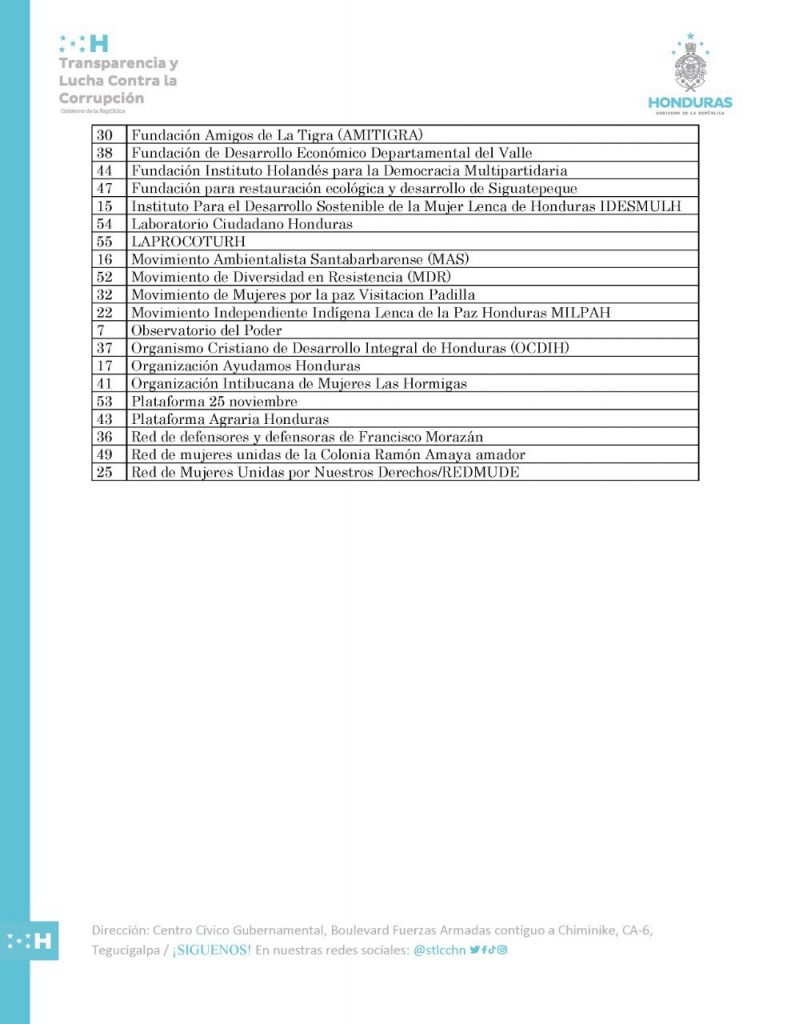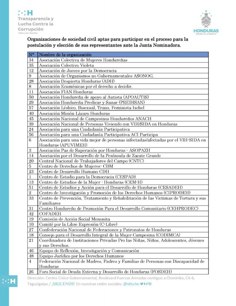 En en una serie de mensajes a través de sus redes sociales la STLCCHN destaca que «hacen de conocimiento público el listado de las organizaciones de sociedad civil habilitadas para participar en el proceso de postulación y elección de sus representantes ante la Junta Nominadora.