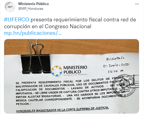 La Unidad Fiscal Especializada Contra Redes de Corrupción (UFERCO), presentó requerimiento fiscal en contra de un diputado, cuatro exdiputados, dos representantes legales y dos contadores de Organizaciones No Gubernamentales (ONG’s) y cinco particulares.